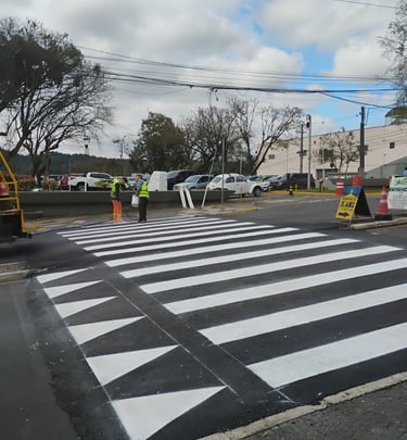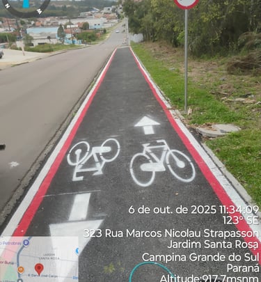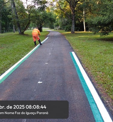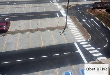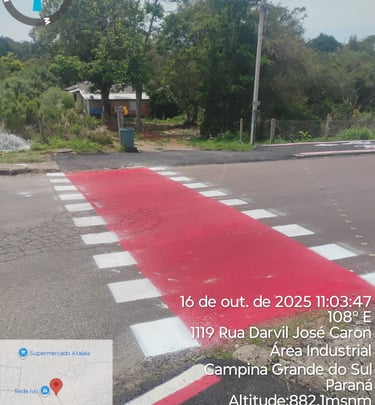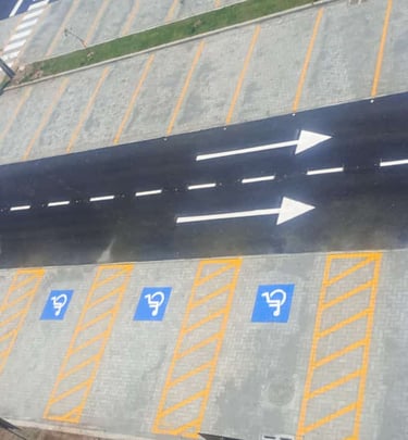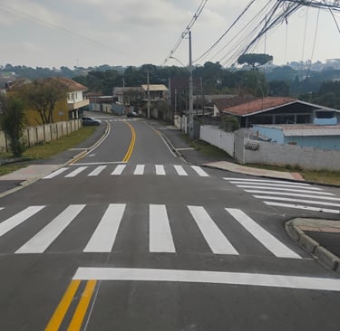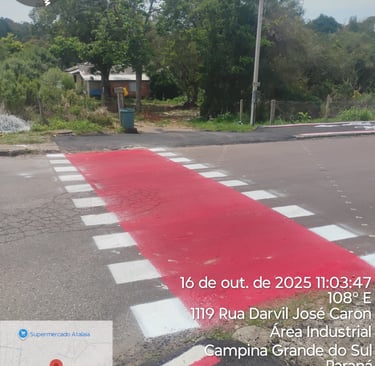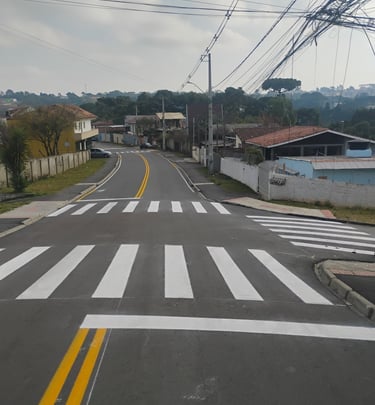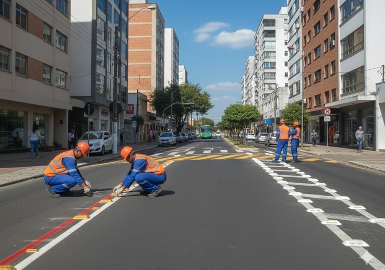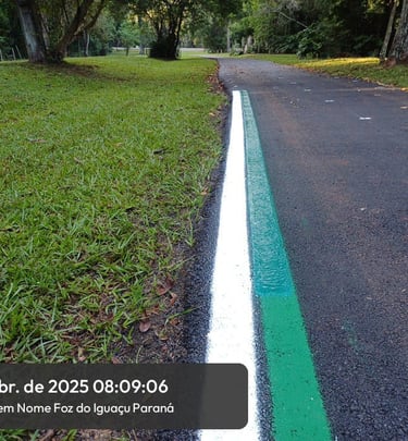 Pintura de faixas de divisão de pista, ciclovias, legendas e símbolos no pavimento com precisão.